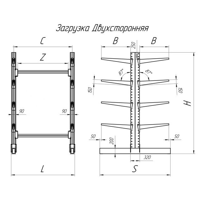 Островной консольный стеллаж (C*S*H) 2000*2100*2000 мм имеет 2 яруса с нагрузкой до 1500 кг на каждый.